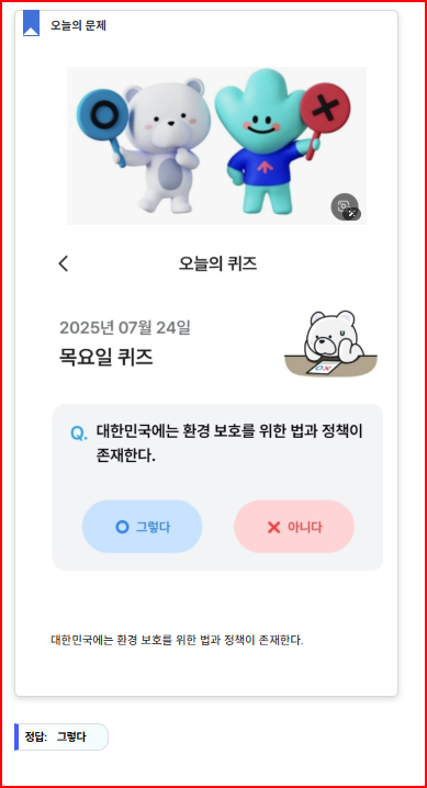 오늘 출제된 문제는 대한민국의 환경 법과 정책에 대한 간단한 OX 퀴즈였어요.