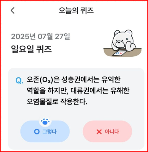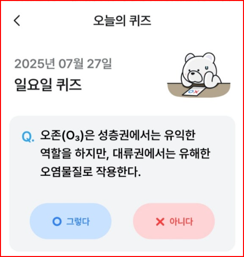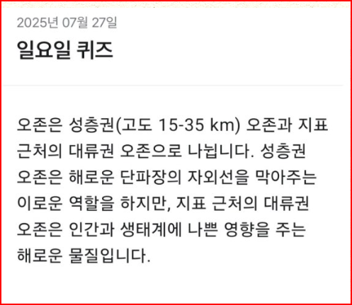 - 정답: O (성층권에서는 유익, 대류권에서는 유해)