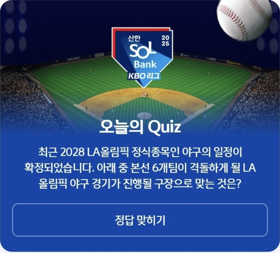 오늘 출제된 문제는 2028년 LA올림픽에서 야구 경기가 열리는 장소를 묻는 내용이었어요. 정식 종목으로 다시 채택된 야구는 많은 스포츠 팬들이 기다려온 종목 중 하나이기 때문에, 관련 뉴스에 관심을 가진 분들이라면 쉽게 맞힐 수 있는 문제였습니다.