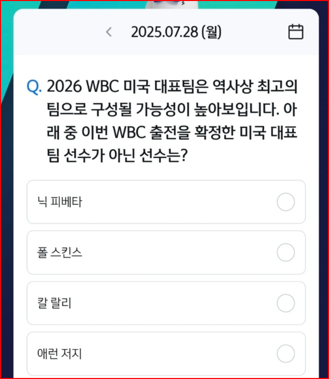 오늘자 퀴즈는 2026 WBC(월드베이스볼클래식) 미국 대표팀 관련 문제로, 평소 스포츠 뉴스에 관심 있는 분들이라면 쉽게 풀 수 있었을 거예요.