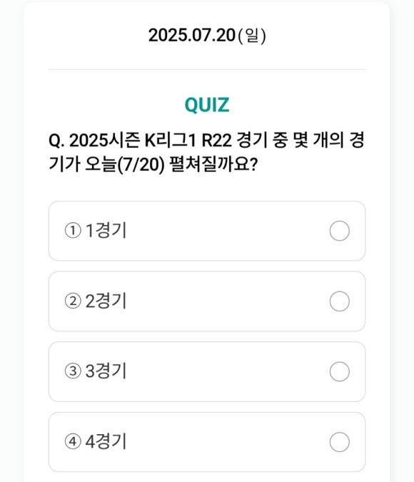 특히 오늘(7월 20일)의 퀴즈는 최근 열린 K리그1 22라운드 일정과 관련된 문제였어요. 단순한 지식 퀴즈를 넘어, 축구 뉴스를 챙겨보는 습관도 자연스럽게 생기니 일석이조랍니다.