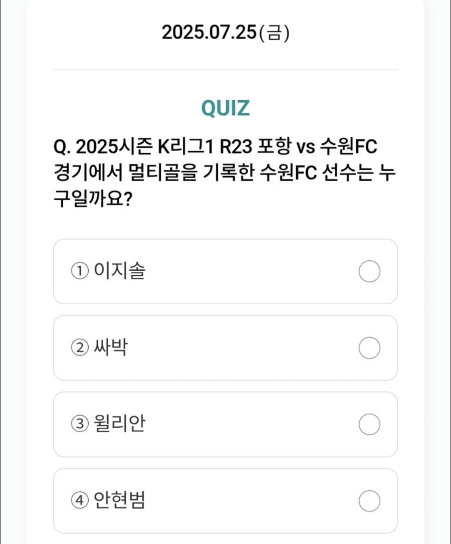 2025년 7월 25일 하나원큐 축구퀴즈의 정답은 윌리안이었습니다.